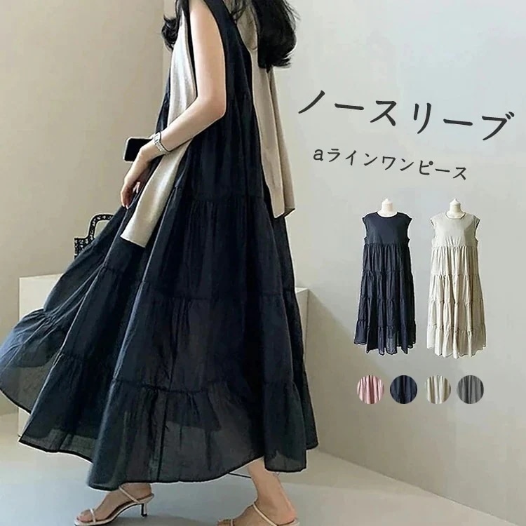 き 体型カバー 二の腕カバー ゆるっと タック ギャザー aラインワンピース ロングワンピース オーバーサイズ 無地 ロング レディース 夏 切替えワンピース ワンピース 黒 ノースリーブワンピース